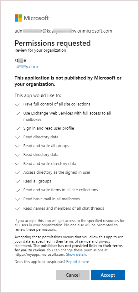 - Click Accept to authorize access to your Microsoft 365 tenant.