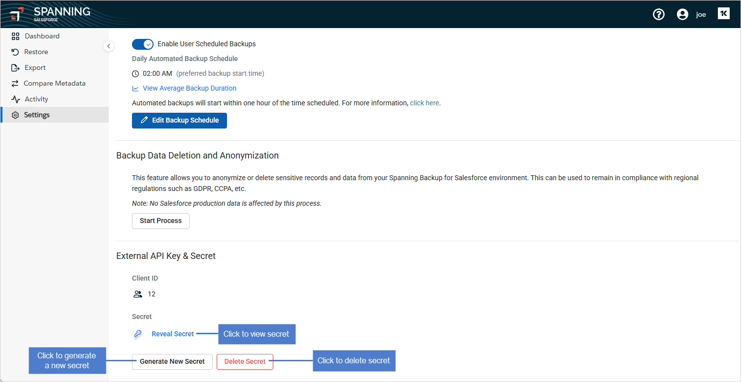 The external API key and secret are used by the Spanning backup process to access Salesforce data. The key and secret were configured during Spanning Backup for Salesforce installation. Use this procedure as needed to view or modify the API secret.